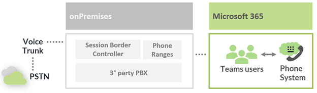 Si tratta dell’architettura prescelta dalle grandi aziende per la transizione a Teams in quanto permette una coesistenza (anche duratura) con i PBX ed i servizi telefonici preesistenti.